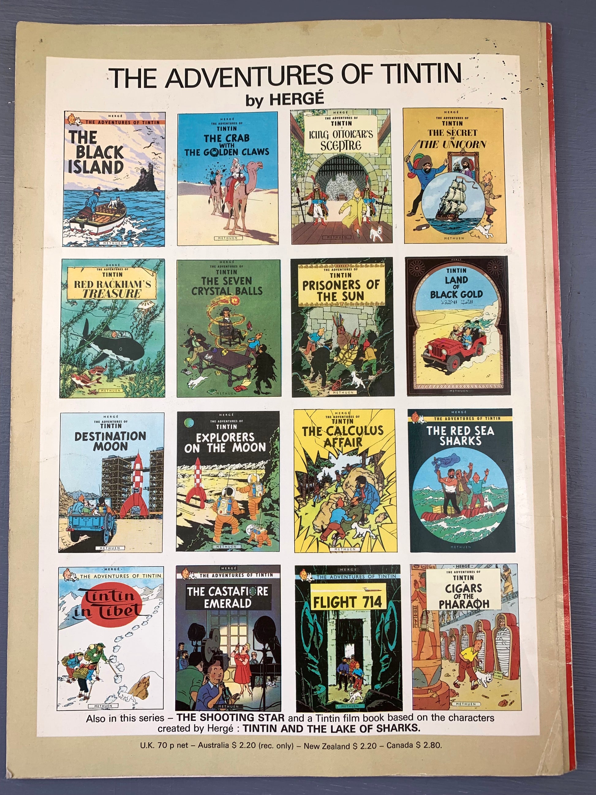 This is the original 1975 1st UK Edition printed by Methuen. Rare and collectible book. Rare Tintin items like this are gaining in value right now due to scarcity and age.