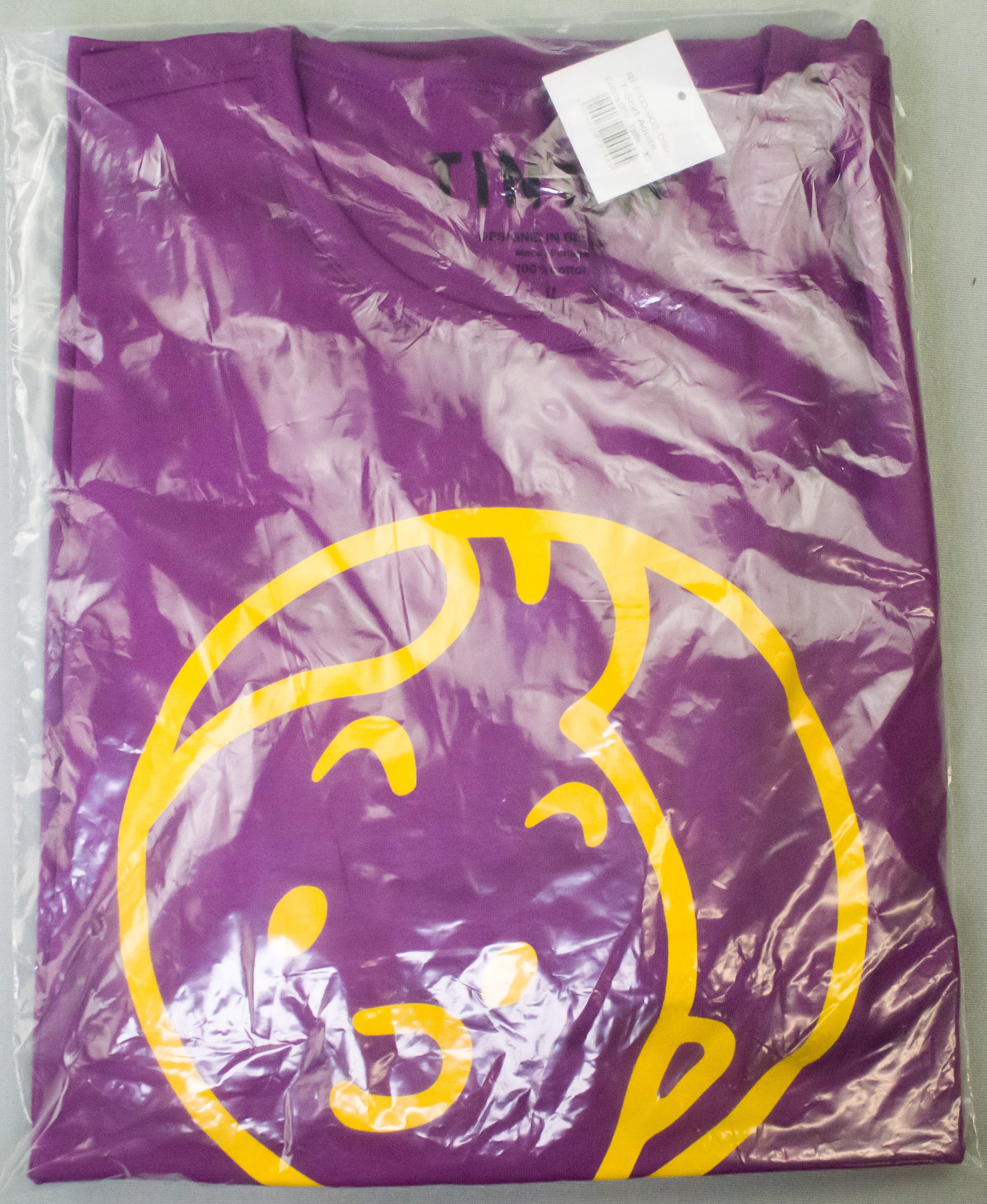 Show off your style with this fashionable adult t-shirt featuring Tintin's face in yellow calligraphy art, set on a purple t-shirt. Soft fabric with slim line styling, and stitched flat neckline.