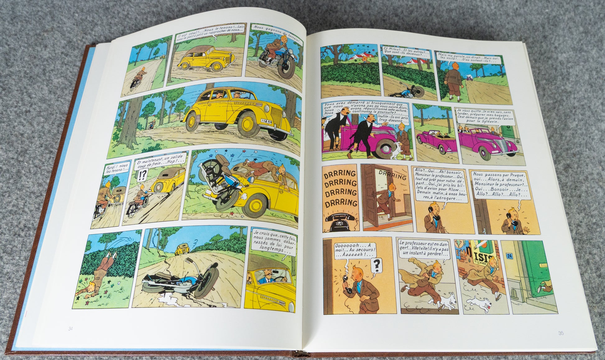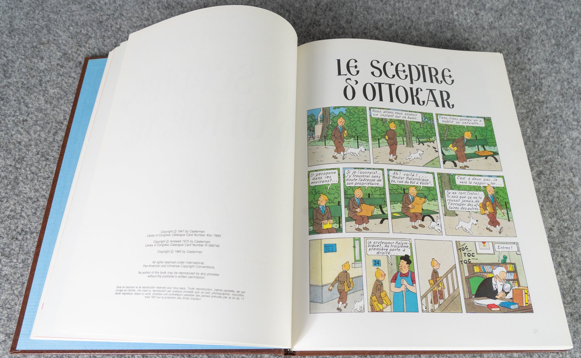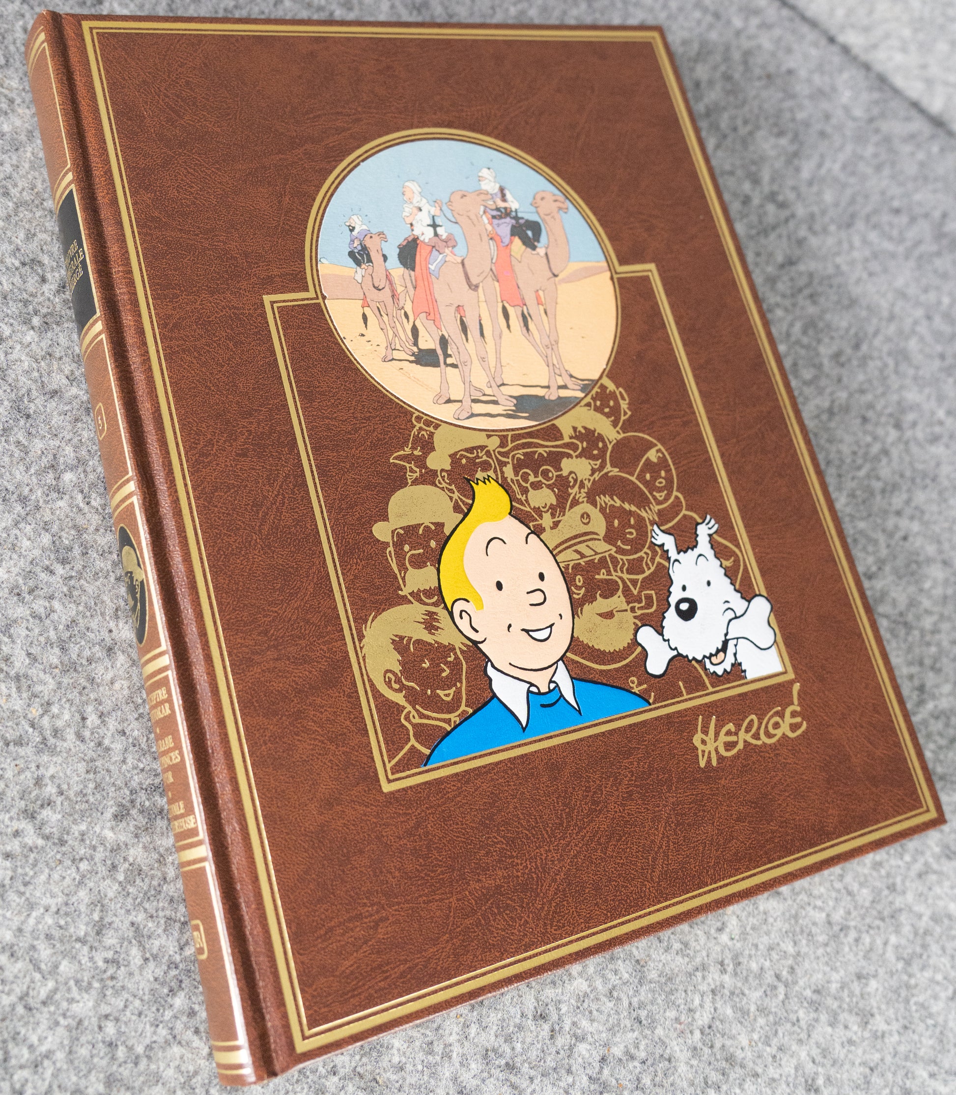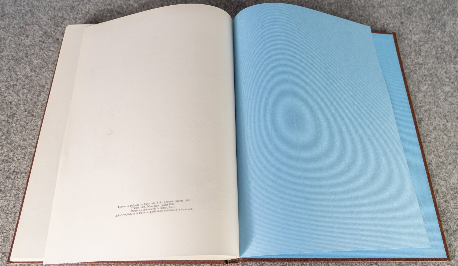 This is the original 1985 1st Belgian Edition printed by Casterman. Beautiful leather-bound hardback book with embossed cover. Rare Tintin items like this are gaining in value right now due to scarcity and age.